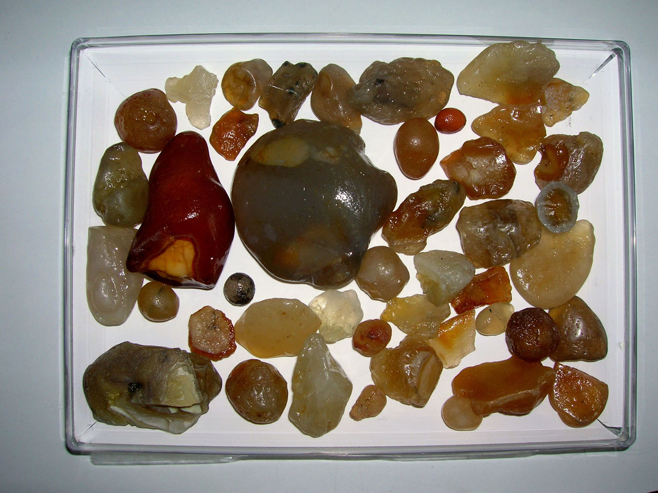 Здравствуйте, уважаемые геологи. На протяжении многих лет я собираю красивые камни, которые в нашей области встречаются повсеместно. Например, по берегам рек. Помогите, пожалуйста, хотя бы примерно определиться с их названиями.