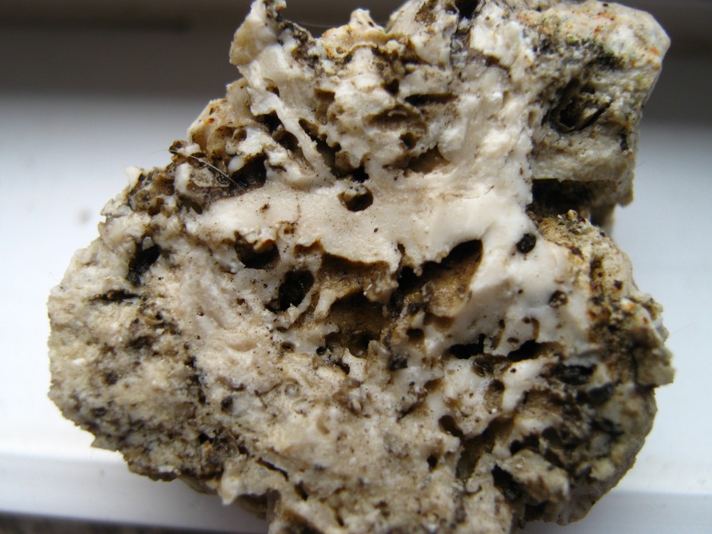 - имеет беловато-сероватый цвет. имеет кучу дырок. стекло не царапает. активно реагирует на уксус - даже после того как сначала я проверил реакцию на воду - просто думал может жидкость вытесняет воздух из него - никакой реакции