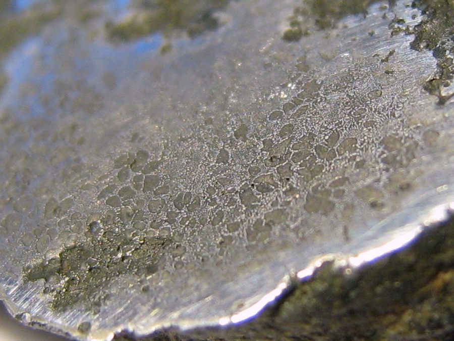 После обработки шлифа азотной кислотой шлиф стал серого цвета и после последующей шлифовки стало видно, что кислота не равномерно воздействовала на метал, появились какие то хаотичные фигуры.