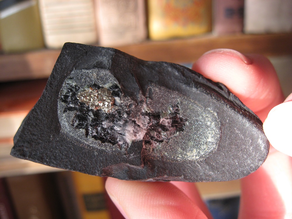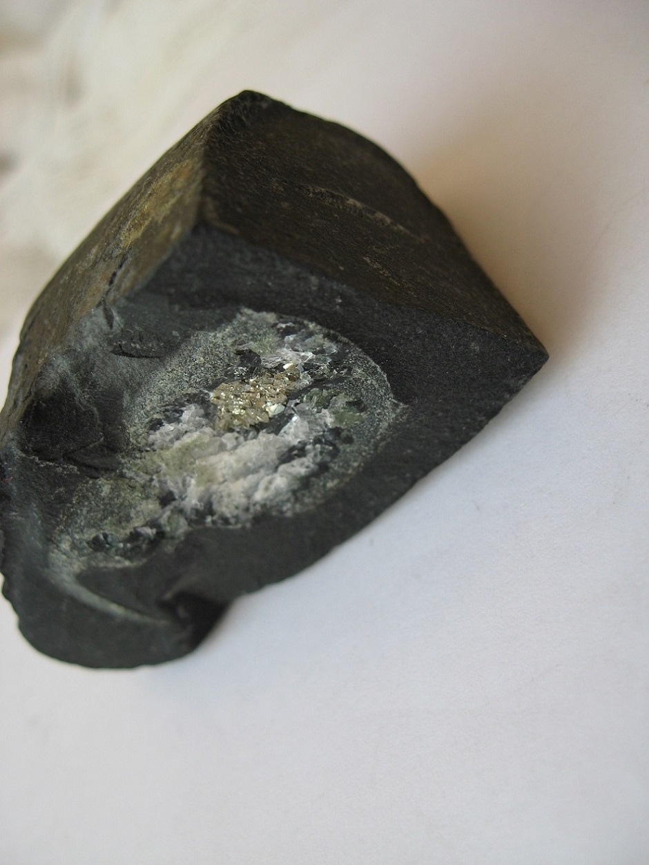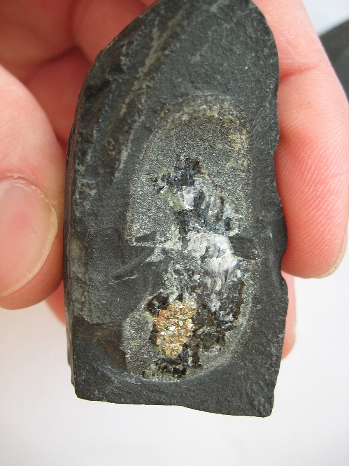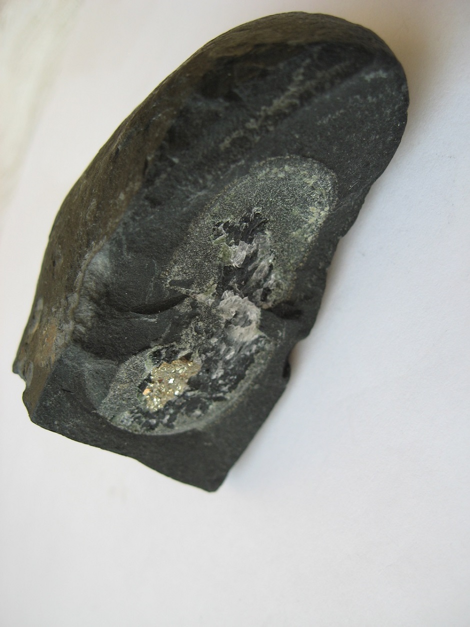 Включение в породе состоит из обычного сульфида, веротяно пирита. Белое - если царапает стекло - кварц, если не царапает и реагирует с кислотой - кальцит.