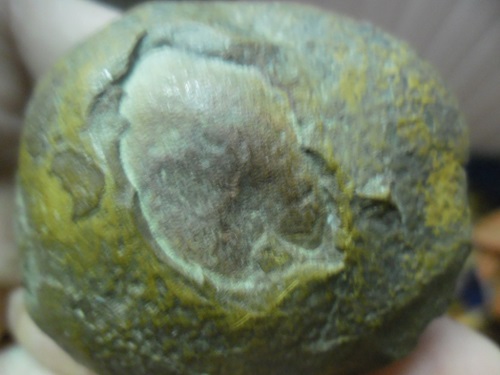 Очевидно, это конкреция. По фото нельзя сказать уверенно какого она состава. Можно попробовать капнуть крепкой уксусной кислотой, если зашипит, то немалую ее часть слагают карбонаты. Про то, что такое конкреции http://mindraw.web.ru/cristall12.htm и на просторах интернета.