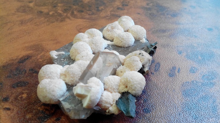 В первом образце бесцветный минерал очень похож на барит, а вот со сферолитами вариантов может быть масса. Известно ли откуда образец? Второй, возможно, арагонит, стронцианит или ватерит (это минералы одной структурной группы). И, кстати, белые сферолиты первого образца тоже могут оказаться стронцианитом.