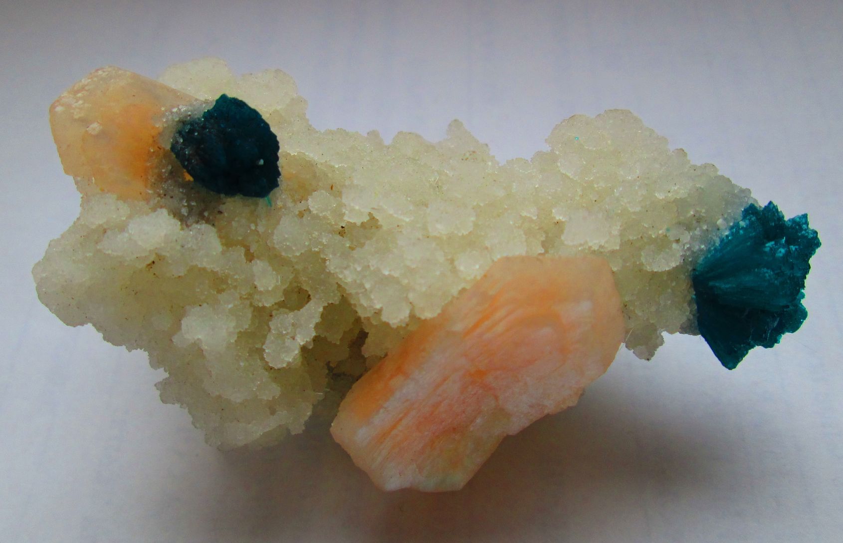 Синее - кавансит, рыжеватое - стильбит, форма кристаллов того, на чем они сидят не видна - это может быть кальцит, кварц, апофиллит, пренит или какой-то цеолит. Скорее всего, конечно, кальцит.