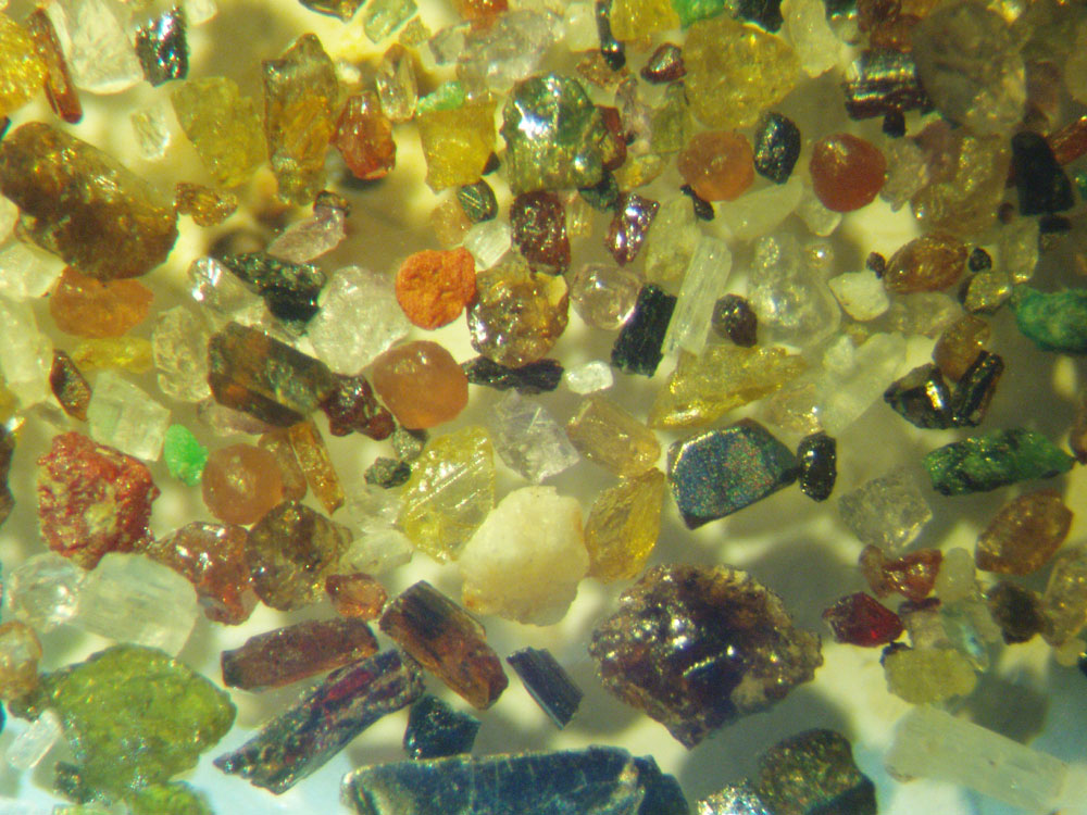Попробуем откупорить пробку, хотя без иммерсии и "кручу-верчу" - сложно. Здесь по двум: гранаты; кварц(разный); берилл(разный?);рутил; лазурит вроде; пироксенчик(..чики), магнетит, диопсид и конечно же золото. Скажите место промывки(район), до какой стадии доводка шлиха и по данной минералогической провинции минералоги должны более точно определить или сказать о шлихе.