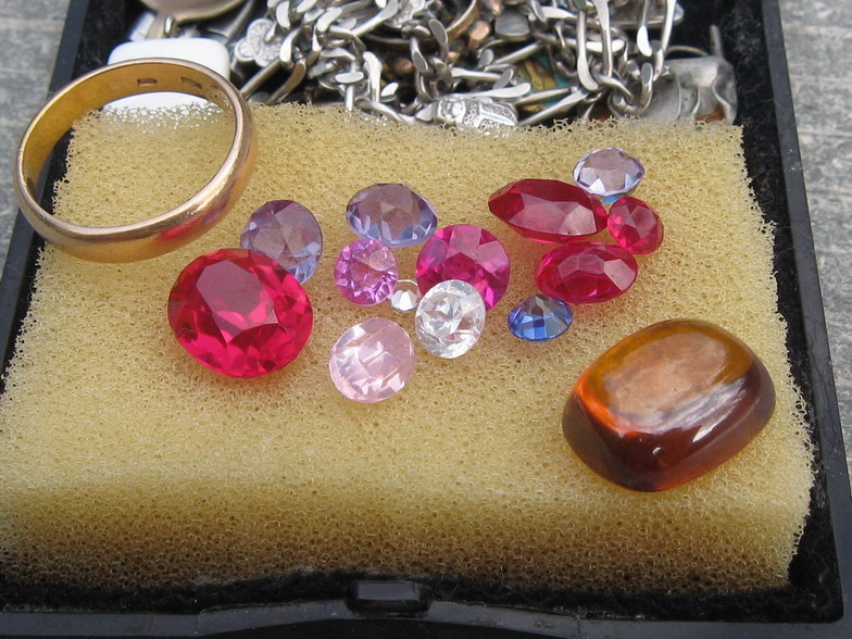 Наши старые, добрые СССРовские изделия! Та основная масса в коробочке - синтетические корунды, разноокрашенные. Это рубины, сапфиры,"александрит". Два в низу светлых - редкоземельные гранаты. Всё, естественно, синтетика. И кольцо-перстень (дамский), скорее всего 80-х годов прошлого века и в нём тоже синтетика - тот же корунд, окрашенный в медовый цвет. У него даже своё торговое название было - "Топаз мадера" или "Пальмирский топаз" в зависимости от цвета (жёлто-коричнеый или коричневый, соответственно).