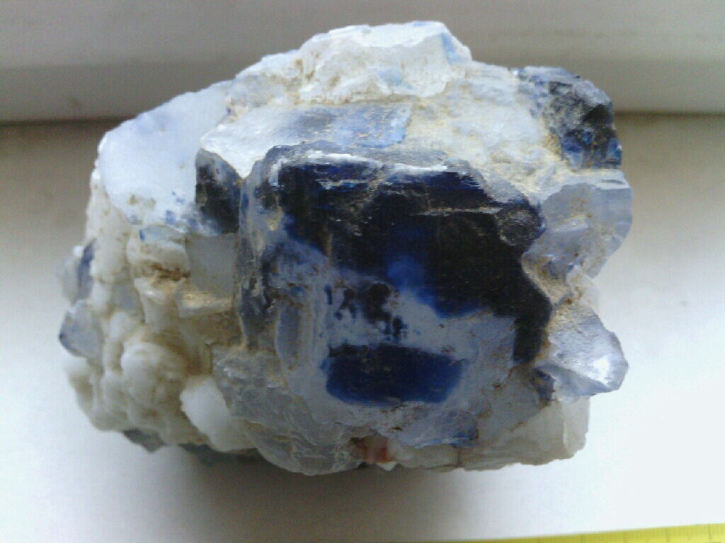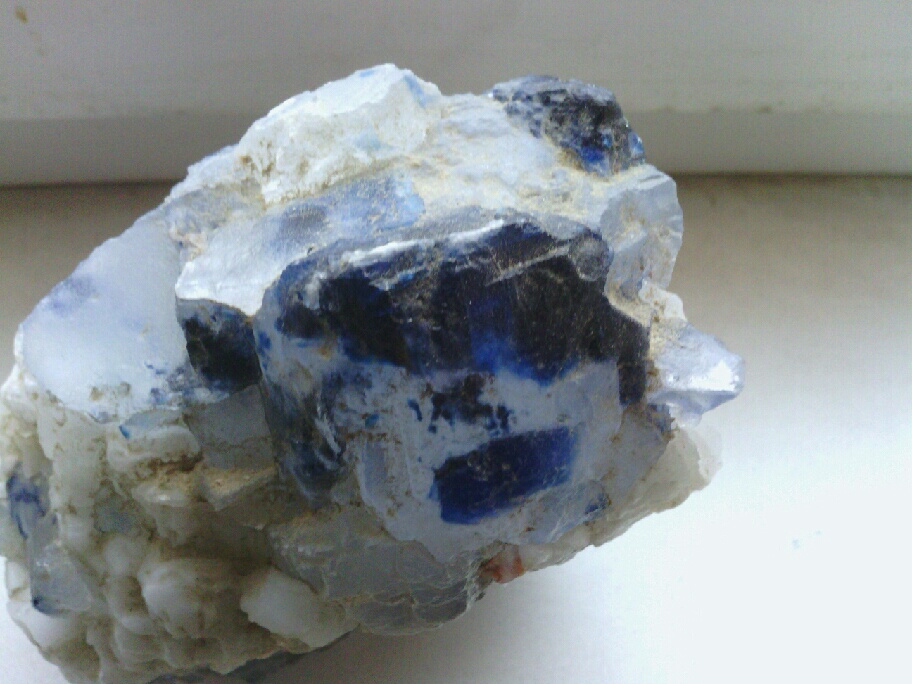 Тут не менее двух минералов. Бесцветный, голубоватый и синий галит, второй - белый сильвин.