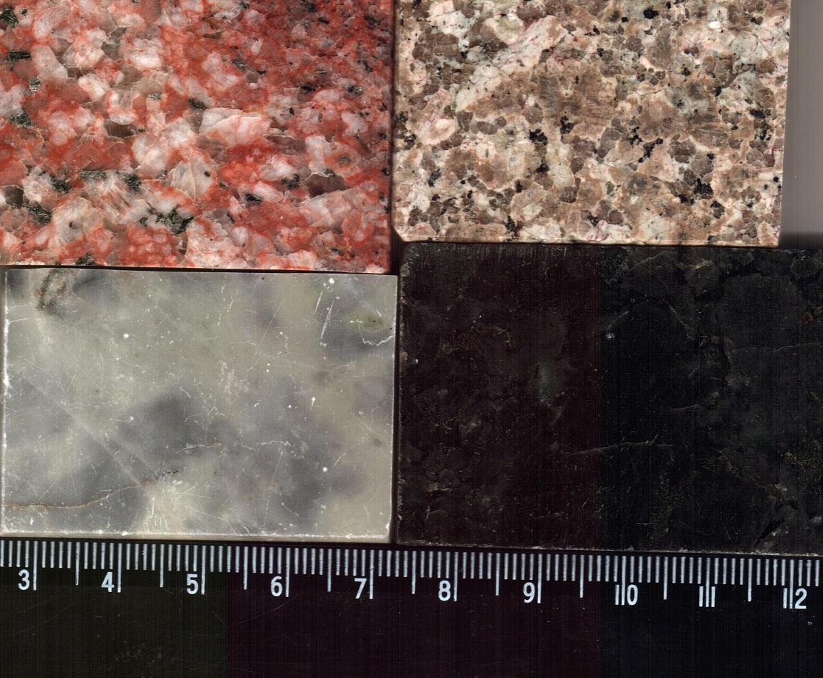 Прошу ответить на вопросы ГДЕ? и ДЛЯ ЧЕГО? и уточнить (расширить) название горных пород (ЧТО?), приводимых на следующих сканфото полированных с одной стороны параллепипедов (пластин). Малое деление масштаба = 1 мм. Цветопередача реальная.