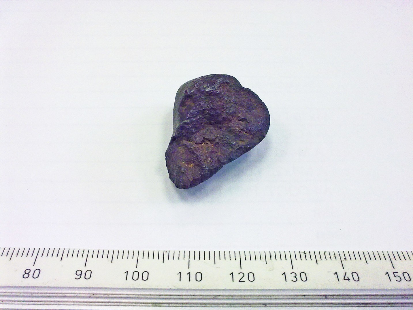 Цвет тёмно-коричневый, стекло царапает, на магнит не реагирует (по крайней мере не заметно), наружная поверхность скруглённая (оплавленная?) с кавернами, одна сторона сколота.