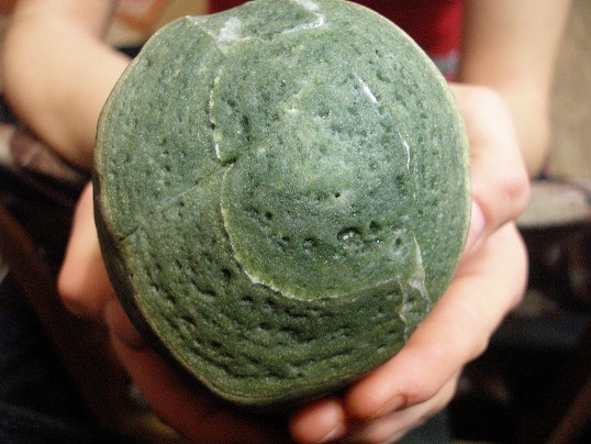 нашёл зелёный камень похожь на сталактит, раскалол а внутри он похожь на мякоть арбуза - мелкие сростки кристалов шарообразной формы и не одного кристала в отдельности. твёрдость не меньше 6.5 с соляной кислотой не реагирует. но мелкий же гадёнышь :D
