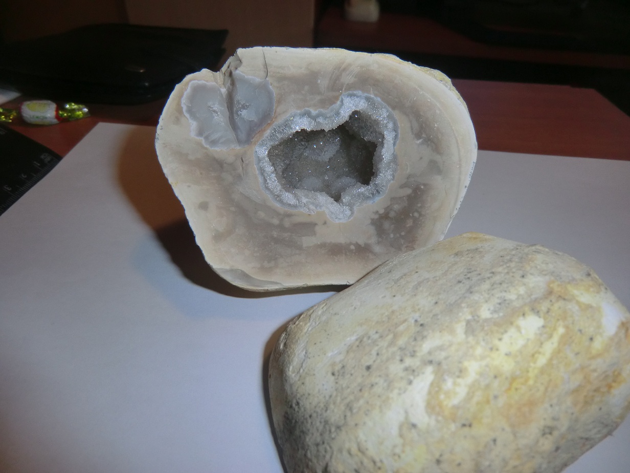 Шарик был цвета слоновой кости. Немного был отколот, а внутри были камушки кристаллообразные бело-прозрачные. "Кора" шарика также состояла из одного ряда камешков. Затем шла прослойка вроде глины матовой. и остальное наполнение также состояло из таких камушков.