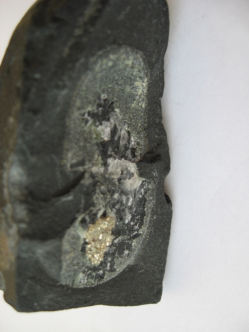 Включение в породе состоит из обычного сульфида, веротяно пирита. Белое - если царапает стекло - кварц, если не царапает и реагирует с кислотой - кальцит.