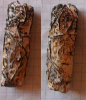 Эта штука только одна попалась. Внутри сероватого цвета. Снаружи совсем черная (белый цвет - забившийся мел). Похож на палочку, которую оплетают в разных направлениях некие нити. Наружный черный налет очень плотный, не соскабливается иглой циркуля. Едва заметная коническая форма и не чуть заметная структура на торце (там, где черный налет отпал) заставляют предположить что это растр белемнита. Но я не уверен.