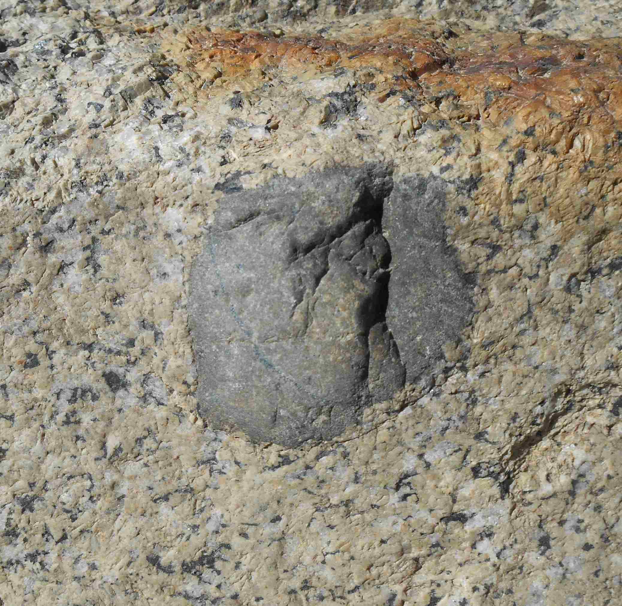 Вот третье фото в более высоком разрешении (нажмите на картинку). Диаметр "креста" - около полуметра. Порода, чем-то похожая на прямоугольник, уходит в землю. Напоминает "столб" с неровными краями.