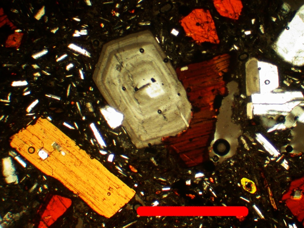 Фомин И.С. писал(а):Ну вот посмотрите во вложенном фото на тёмно-коричневое зерно в центре и светло-жёлтое внизу слева. Это - спайность в биотите. Сам образец - это японский вулканит 1995 года (фото из моего личного архива ;) , первое, что в голову пришло), который гарантированно никаким импактным событиям не подвергался. Не всякие продольные линии на зерне - планарные структуры.