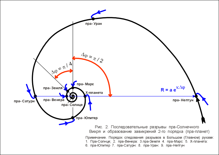 Однако, более простая закономерность, более точная, а главное, содержащая в себе объяснения физической сущности процессов распределения в пространстве: - Солнца, планет и их спутников, содержится в формуле Космогенного Вихря, R=a*e^(k*фи).