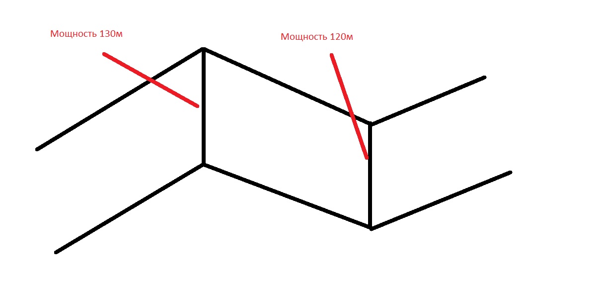 Пошел другим путем. По формуле Левантовского нашел мощность в замке одной складки и откладывал ее от кровли пласта. Высотную отметку кровли пласта находил решая прямоугольный треугольник(см. выше). Мощности совпали.