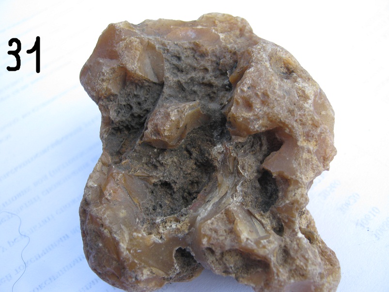 31 - кремни обычно образуются в известняках. При этом замещение идёт избирательно (где-то больше, где-то меньше). Потом, при высвобождении кремня из известняка включения известняка растворяются, образуя полости в кремне.