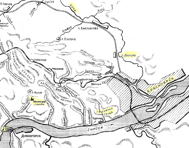 ­ ­ ­ Видите Енисей внизу? Самые важные объекты я выделил цветом. Это НЕ геологическая карта, а краеведческая, поэтому не удивляйтесь, что на ней нет никаких разломов. Разлом между платформами идёт по Енисею — справа налево до плотины Красноярской ГЭС (скраю слева), перед плотиной разлом сходит с русла Енисея и идёт вверх, где Вы видите Мининские Столбы. Это тот самый «нырок» разлома к Красноярску, который Вы видите на карте, размещённой выше этой. Но Павел Самородский настолько НЕ знает местного ландшафта, что в конец запутался, где же там Мининские Столбы, и как же это сопрячь с картой стыка платформ. Изображение