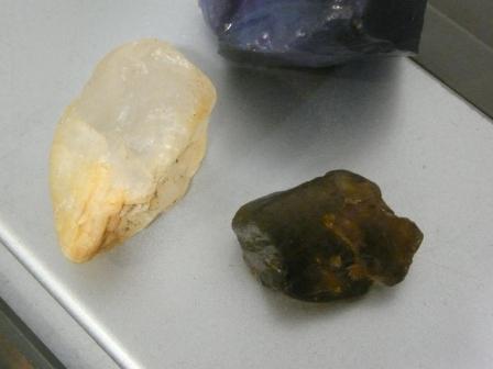Тот что слева очень похож на жильный кварц. Попробуйте поцарапать им стекло
