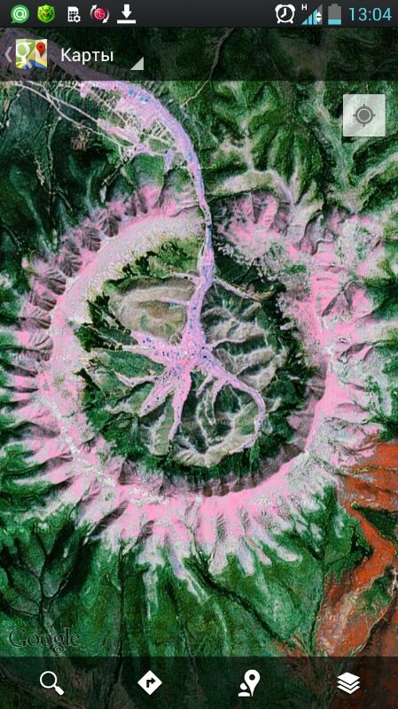 Мы с другом, с помощью google maps, на просторах нашей родины, нашли, вот такой вот, интересный кратер. Как вы считаете - какова природа его происхождения? Друг говорит, что он от падения метеорита, или от взрыва. А мне кажется, что это обыкновенный вулкан. Но почему он весь розовый, с чем это связано?