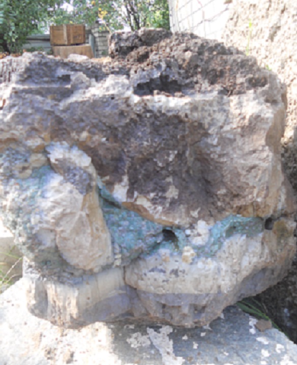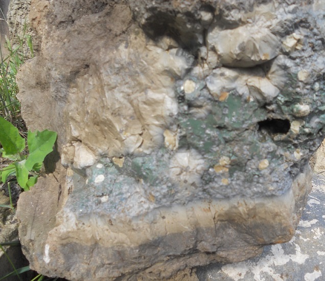 Найден камень. Почему-то весь как-будто слоями.Интересует больше всего зеленый слой.Помогите определить что это за порода?