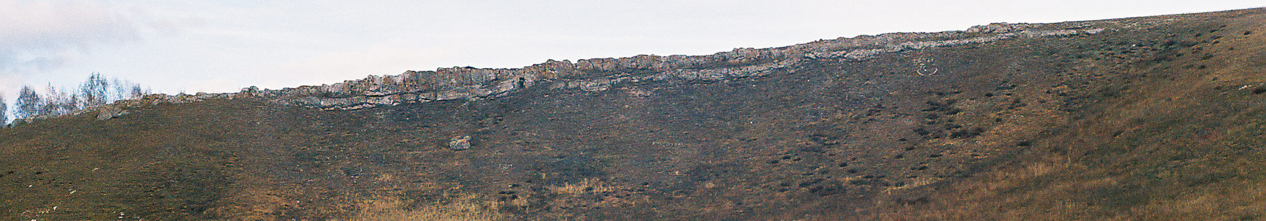 Это деревня Кузнецово; от конька крыши дома слева тянется (вправо вверх) белый гребень сопки — осадочной куэсты. Об этих гребнях и идёт речь. Если спуститься по дороге вниз в деревню и из деревни взглянуть на этот гребень, то Вы увидите его таким: Вот крупный план: ОЧЕНЬ советую кликнуть эти два снимка (чтобы открыть их в полный размер). Кузнецовские гребни — это местное чудо природы; со стороны они, как Вы видите, чрезвычайно напоминают человекотворные крепостные стены, но имеют чисто природное происхождение — это просто обнажившиеся гребни известняковых сопок.