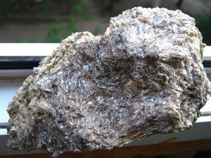 Это так называемые "ёльчатые" агрегаты слюды (мусковита) в граните (серый кварц и желтоватый полевой шпат) http://www.mindat.org/photo-213371.html Ваш образец очень неплох