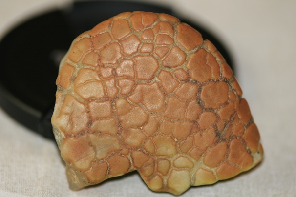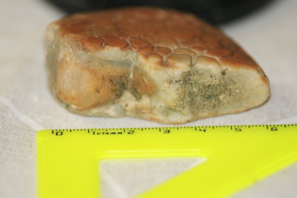 Найден в реке среди камней форма необычная внутри структура тоже довольно необычная. Посредине округлое беловатое вещество, а по краям пористая похожая на кость , и к краю тонкий слой чего-то, снаружи растрескавшийся. Как то так.